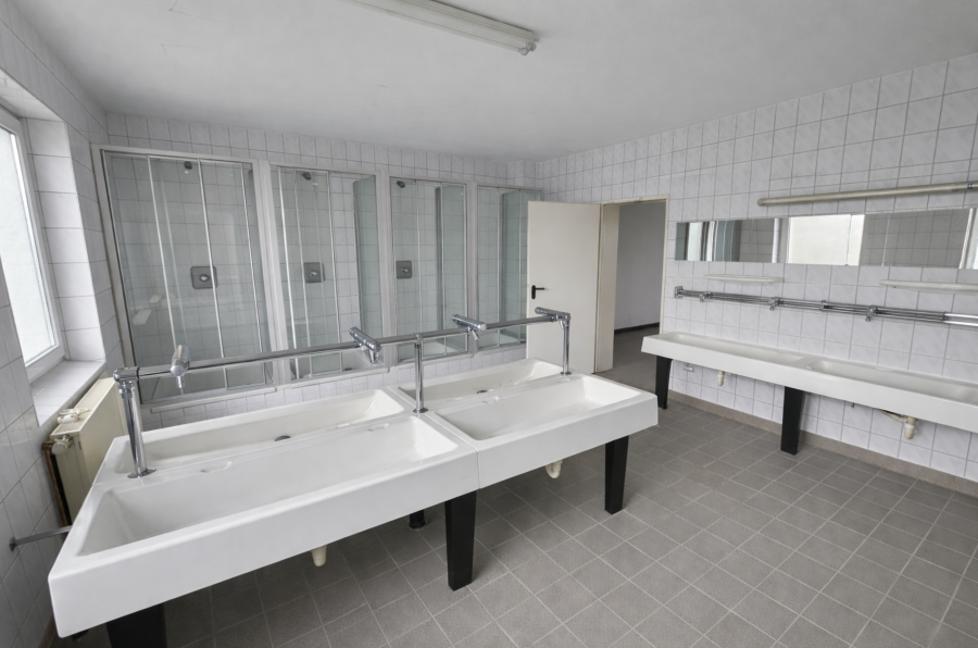 - großes Sozialgebäude, unterkellert, 10 WCs, 8 Duschen, 2 Treppenhäuser, Fliesenboden, Büros, Kantine, Heizraum
